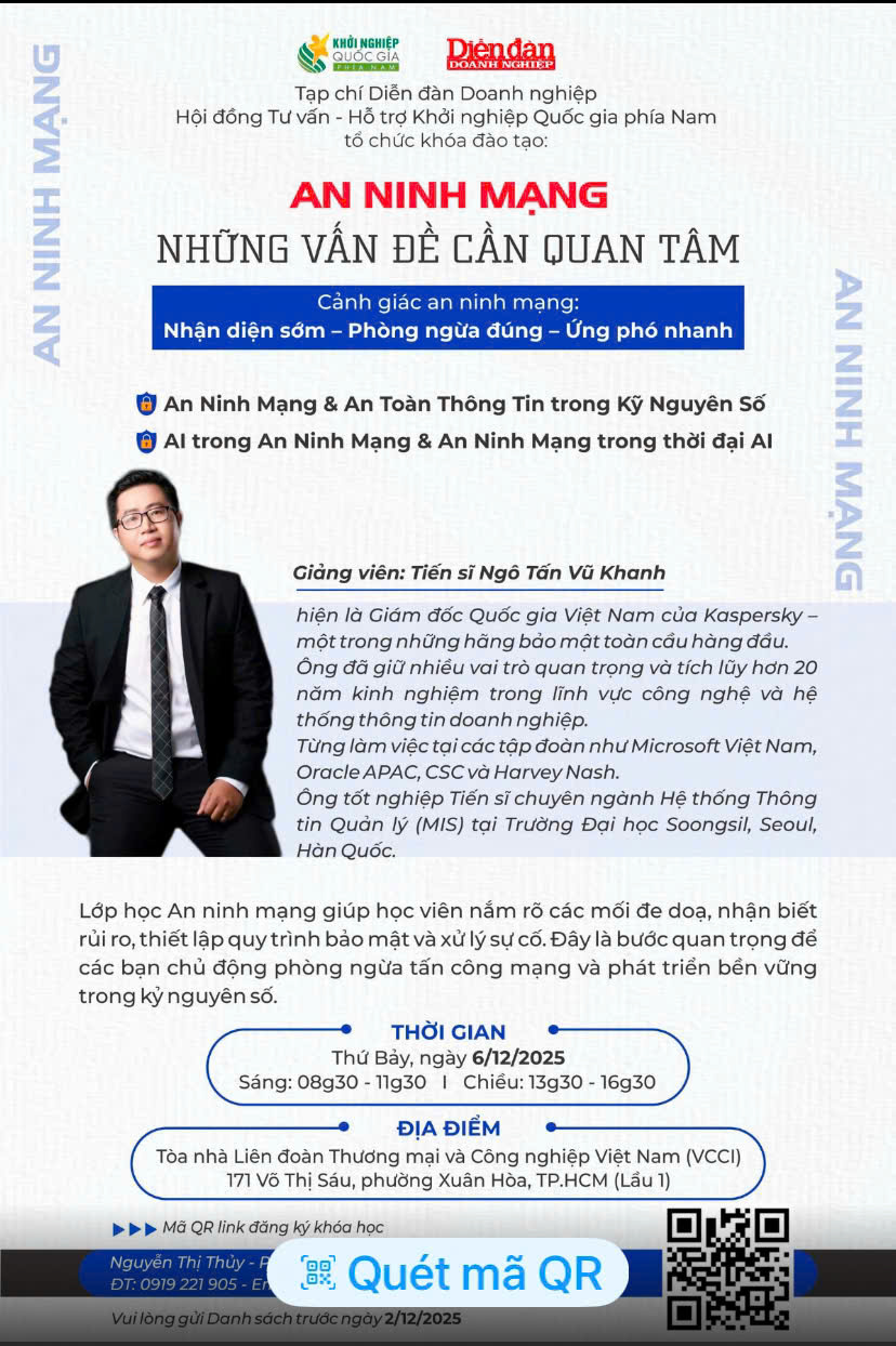Trong thời đại số, doanh nghiệp không chỉ cạnh tranh về sản phẩm mà còn phải “chiến đấu” mỗi ngày trước các nguy cơ tấn công mạng. Để giúp doanh nghiệp chủ động bảo vệ dữ liệu và hệ thống, chúng tôi tổ chức lớp đào tạo An ninh mạng do TS. Ngô Tấn Vũ Khanh trực tiếp giảng dạy.